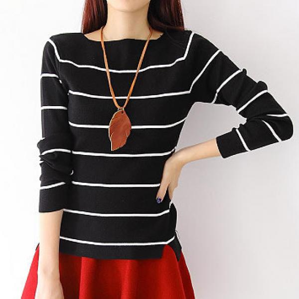 【美丽家】2014秋装新款韩范气质条纹针织衫毛衣修身套头衫 一字领条纹打底衫