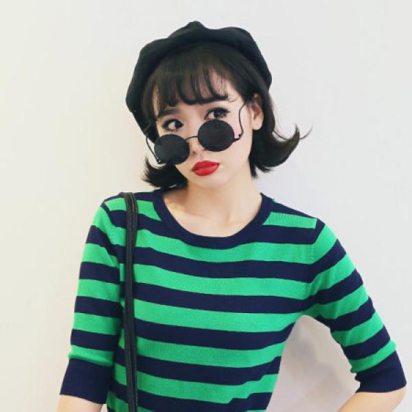 红人馆 619#欧美风条纹短袖圆领休闲t恤打底衫新款女百搭
