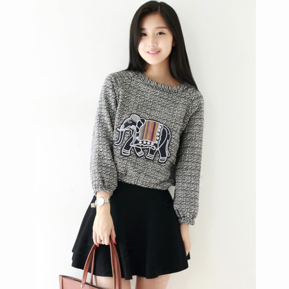 时尚简洁的圆领,插肩袖长袖设计,松紧收袖口及下摆,修身身形,胸前可爱小象刺绣图案贴布,十分灵动呢~略显宽松的款式,胖瘦M