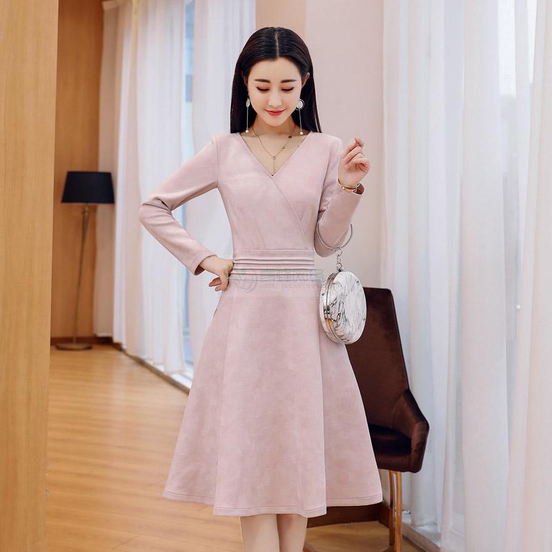 春装2018新款女装气质连衣裙V领韩版春季长袖中长款修身纯色...